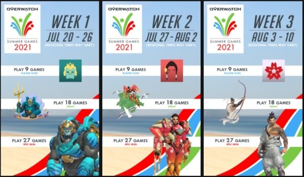 Por otra parte, cada semana habrá recompensas especiales por jugar los modos Partida rápida, Juego Competitivo o Arcade. Los jugadores podrán desbloquear íconos de jugador, sprays y diseños con temática veraniega de Winston, Pharah y Hanzo. Cada victoria contará como dos partidas para el progreso del desafío.