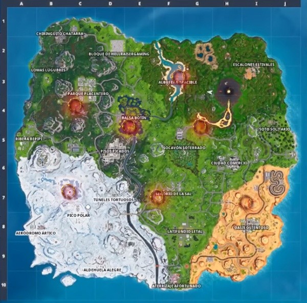 Encontrarás los círculos llameantes en los siguientes lugares en Fortnite: