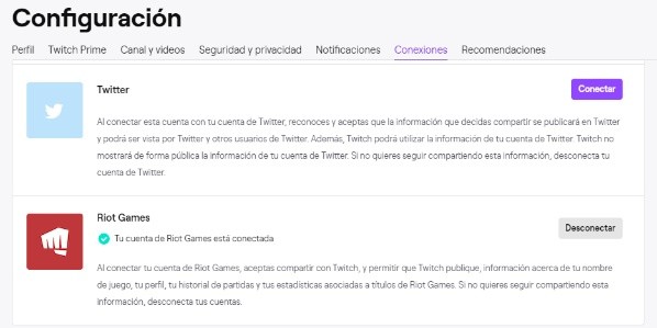 Muy bien, habiendo aclarado eso, lo único que deben hacer al tener una cuenta de Riot Games en Europa o Latinoamérica es dirigirse a menú de opciones en el perfil de Twitch, elegir la opción “Conexiones/Connections”, y en Conexiones Recomendadas aparecerá Riot Games. Allí activan la opción, ponen su cuenta y contraseña de Riot Games, le dan a “Autorizar” y la cuenta ya estará conectada.
