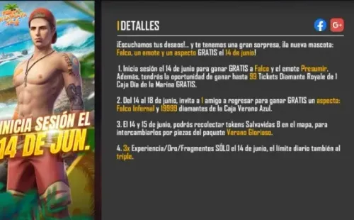 Los Sobrevivientes podrán conseguir una Caja de Verano Azul al invitar un amigo a regresar a Free Fire, dentro de la caja podrán ganar gratis un aspecto: Falco Infernal y 19999 diamantes, tal y como reveló el tablón de anuncios de Free Fire dentro del juego.