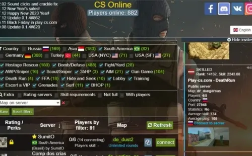 Hay servidores en Alemania, Brasi, Estados Unidos, Indonesa, Rusia y Turquía en los cuales se alojan los servidores a los que podrás unirte a jugar. Lógicamente, mientras más cerca estes del servidor, menor latencia (ping) tendrás a la hora de jugar. En la pantalla principal tendrás bastante información, como tu nombre y rango (si te registraste), opciones para filtrar los servidores por ubicación, modo de juego y mapas, idioma y cantidad de jugadores en línea.