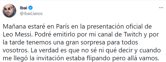 Ibai escribió en su Twitter que “Mañana estaré en París en la presentación oficial de Leo Messi. Podré emitirlo por mi canal de Twitch y por la tarde tenemos una gran sorpresa para todos vosotros. La verdad es que no sé ni qué decir y cuando me llegó la invitación estaba flipando pero allá vamos”.