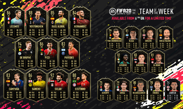 EA Sports reveló el Equipo de la Semana 14 del FIFA 20 y los fanáticos del Ultimate Team se encontrarán con dos cartas sumamente preciadas: Kevin De Bruyne con 94 de valoración y Mohamed Salah, quien alcanzó 92 en su IF.