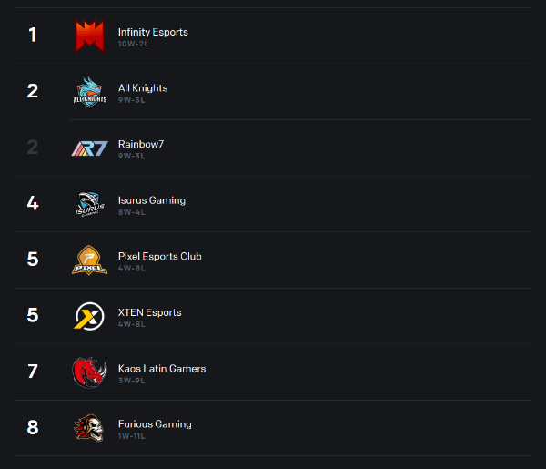 All Knightsse quedó con el segundo lugar en la Liga MovistarLatinoamérica, luego de esta partida, junto a Rainbow7, que venció al lider Infinity y lleva una impresionante racha de cuatro victorias al hilo.