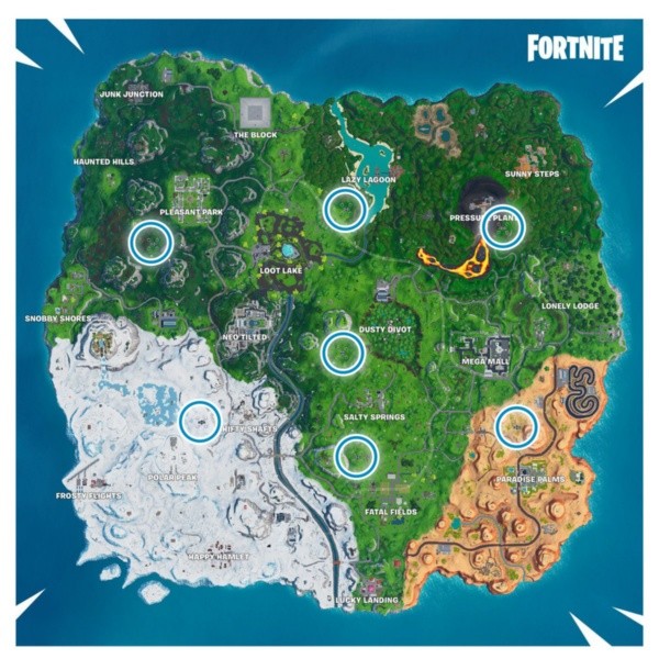 Las plataformas celestes las encontrarás en las alturas y son capaces de impulsarte por el aire. Se encuentran en diferentes lugares del mapa (imagen abajo) y seguramente estos días estén bastante recurridas por el desafío. Necesitas eliminar 3 oponentes en ellas para completar el desafío.