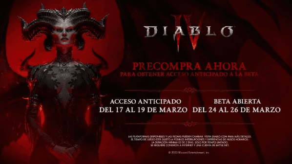 Para quienes hayan reservado Diablo IV, elacceso anticipado a la Betaserá del17 al 19 de marzo. Durante el fin de semana siguiente, laBeta abiertaestará disponible para todo el mundo del24 al 26 de marzo. Estarán disponibles enWindowsPC,Xbox Series X|S,Xbox One,PlayStation 5, yPlayStation 4.