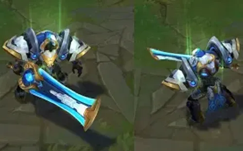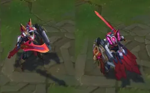La nueva línea de aspectos Reinos Mecha tiene cinco protagonistas. Jax fue el destacado en el video promocional, ya que tendrá por primera vez un arma en su mano. El nuevo campeón, Sett, formará parte de Reinos Mecha, al igual que Leona, Draven y Garen. Éste último contará con la Edición Prestigiosa del parche.