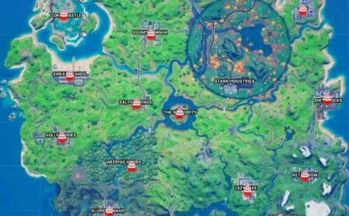A continuación puedes ver el mapa de Fortnite con las ubicaciones de los pasteles marcadas en él, recuerda que deberás bailar delante de diez pasteles diferentes, por lo que no contará el mismo pastel aunque lo visites en diferentes partidas.