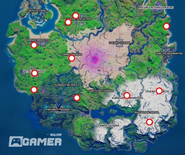 Por suerte este desafío no será tan complicado, ya que necesitas destruir cinco estatuas, y hay más de diez distribuídas alrededor de la isla. Eso sí, no todas aparecen en cada partida, por lo que tal vez deberás entrar más de una vez al juego para completar el desafío. Las ubicaciones de las estatuas son las siguientes: