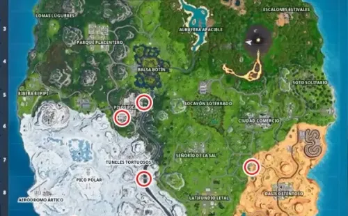 Aquí tienes un mapa con la ubicación de siete piezas del rompecabezas, que encontrarás bajo puentes y en cuevas. Fortnite cuenta con más de siete puentes/cuevas en el juego, por lo cual encontrarás más piezas, pero con conseguir las que aparecen debajo, podrás completar el desafío y estarás más cerca de conseguir tuskinde Ruina.