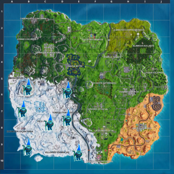 Estas son las ubicaciones en el mapa de los siete gnomos congelados que debes encontrar para completar el desafío de la Semana 6 de la Temporada 7 de Fortnite:
