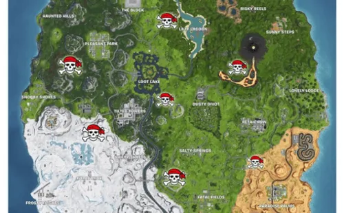Básicamente deberás acercarte a un campamento pirata en 10 partidas para completar el desafío. Los campamentos piratas se encuentran en las siguientes ubicaciones dentro de la isla de Fortnite: