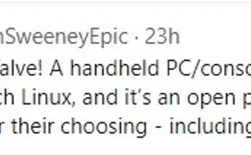 “¡Increible jugada por parte de Valve!“, escribió Sweeney en la red social. “Un híbrido de PC portátil y consola corriendo con SteamOS, y es una plataforma abierta donde los usuarios son libres de instalar el software que elijan, incluyendo Windows y otras tiendas”, concluyó.