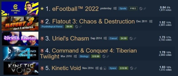 Esta calificación de 8/100 ha transformado al eFootball en el juego peor calificado de la historia de la plataforma de juegos de Valve, lugar que ocupaba Flatout 3: Chaos & Destruction, lanzado en 2011, con un15% en su calificación.