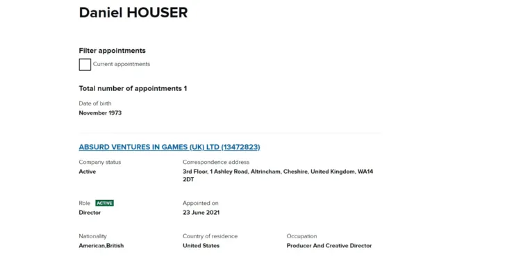 De acuerdo a su listado en la registradora británica de compañías,Absurd Ventures in Games es una “desarrolladora de software de entretenimiento interactivo”, dando a entender que producirán videojuegos. En febrero de 2021 Houser registró otra empresa, Absurd Ventures, que tendrá su base en Delaware, Estados Unidos.