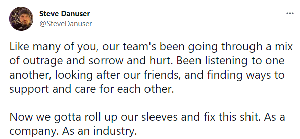 “Como muchos de ustedes, nuestro equipo ha estado pasando por una mezcla de indignación, pena, y dolor”, escribió el diseñador de narrativa Steve Danuser. Otro usuario llamado Burk, quien trabaja como productor,escribió que“estamos enojados, y no vamos a ser silenciados tan fácilmente”.