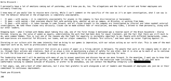 El correo menciona que él y otros ejecutivos tendrán varias reuniones con los empleados “para contestar preguntas y debatir cómo seguiremos adelante”. Cabe destacar que la demanda lo nombra a Allen Brack como responsable de no hacer nada al respecto de estas situaciones.
