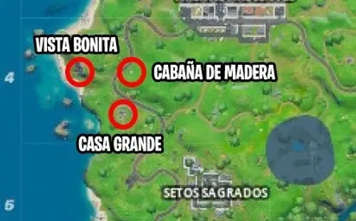 Una vez que te asegures de tener disponible la misión, lo siguiente será buscar la Vista Bonita, la Cabaña de Madera y la Casa Grande, las cuales les marcamos en el siguiente mapa: