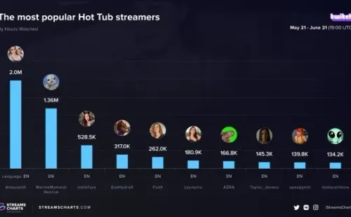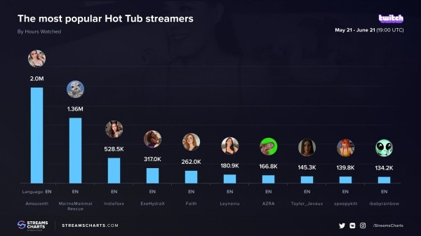 Aún así, Amouranth sigue teniendo la corona en la cantidad de horas que los espectadores pasaron viendo este tipo de streams. Streams Charts demuestra que entre el 21 de mayo y el 21 de junio, mismo lapso temporal en el que se tomaron las anteriores estadísticas, el público vio 2 millones de horas de Amouranth en la categoría de Hot Tub.
