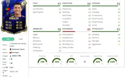Con 99de valoración, la carta de Cristiano Ronaldo es mucho más alta que lo esperada y supera incluso al resto de los delanteros del TOTY, ya que Kylian Mbappé tiene 98 y Sadio Mané 97. Sólo Lionel Messi TOTY es comparable a la carta de Cristiano Ronaldo en la delantera. Estas son sus estadísticas: