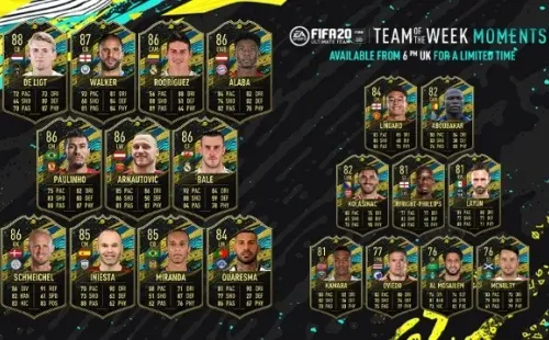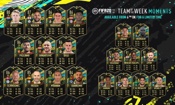 Las cartas de TOTW Moments reemplazarán a las clásicas de TOTW en Recompensas de FUT Champions, sobres, batallas semanales destacadas, requerimientos de SBC, objetivos futuros de FUT y Draft Mode. Las primeras cartas de TOTW Moments son las siguientes: