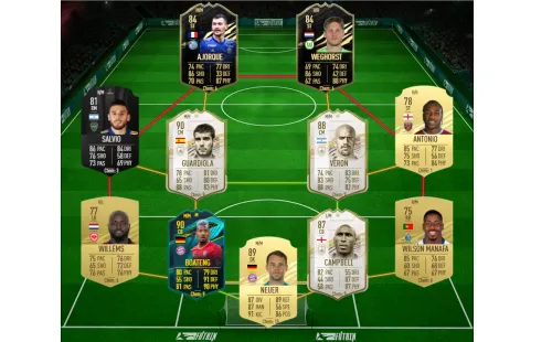 Posteriormente, se necesitan delanteros capaces de saltar y cabecear con precisión. Sí, a todos se nos viene a la cabeza Cristiano Ronaldo, aunque la selección del jugador en cuestión es mucho más modesta y novedosa: Ajorque (DC|84 – IF) y Weghorst (DC|84 – IF), dos cartas de muy bajo valor, pero alta jerarquía para la táctica.