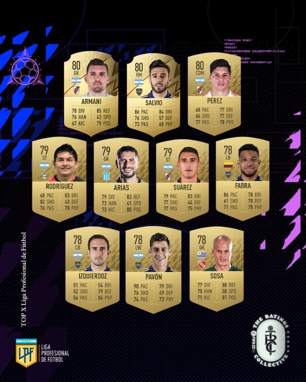 El Pulga Rodriguez, hoy en Gimnasia y Esgrima La Plata, pero figura del Colón campeón alcanzó una valoración de 79, al igual que Matías Suárez y Gastón Arias. Finalmente, la lista la completan Frank Fabra, Carlos Izquierdoz, Cristian Pavón y Sebastián Sosa, todos con una valoración de 78.