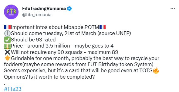 Según la filtración de FIFA Trading Romania, que cita como fuente a la UNFP, saldrá el próximo martes 21 de marzo. Debería tener 93 de media, un punto más que el anterior POTM y la misma valoración que su carta del Mundial.