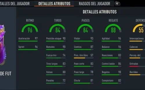 Si entramos más en detalle podemos encontrar interesantes valores en Remate (90), Agilidad (94) y Balance (96).Otro de los puntos positivos es quecrafteareste SBC es que para conseguirlo se debe entregar una Plantilla de 83 de valoración con un IF, y otra de 84 de valoración con un IF, todas cartas que se consiguen fácil en sobres y en mejoras actualmente.