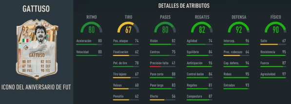 Gattuso Icono FUT Birthday ya se puede conseguir en Desafío de Creación de Plantilla, y aquí repasamos si vale la pena. Primero vemos sus stats: tiene 3 puntos más que su versión Prime y así supera los 80 en todo menos disparo, siendo un centrocampista enfocado principalmente en la defensa.