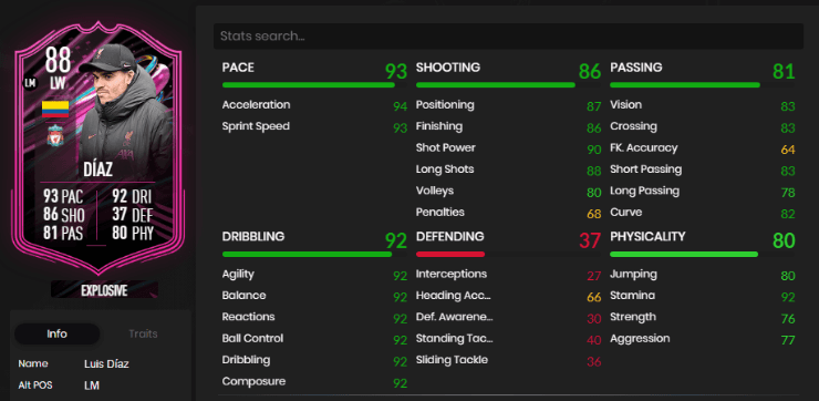 En primer lugar, repasamos sus estadísticas. La carta de por sí es sólida, pero el verdadero beneficio viene de mejorarla a través del objetivo “Play to Style“. Al hacerlo nos quedamos con la versión de 88 de media, que mejora todos sus atributos, enfocándose sobre todo en el regate.