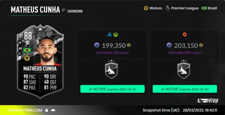 Matheus Cunha Showdown ya está disponible para hacer mediante un Desafío de Creación de Plantillas, que se podrá completar hasta el 31 de marzo. Si Wolves llega a empatar o ganar esta fecha contra el Nottingham, su carta subirá +2 de media y recibirá cinco estrellas de pierna mala.