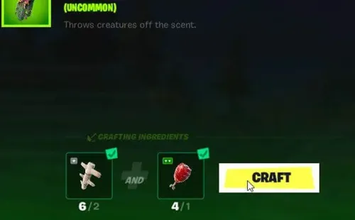 Una vez que tengas dos huesos y un pedazo de carne en tu inventario, deberás seleccionar la carne en tu inventario y apretar en la sección de fabricación a la derecha del inventario. Allí verás la capa del cazador, y seleccionar en fabricar te permitirá hacerlo.