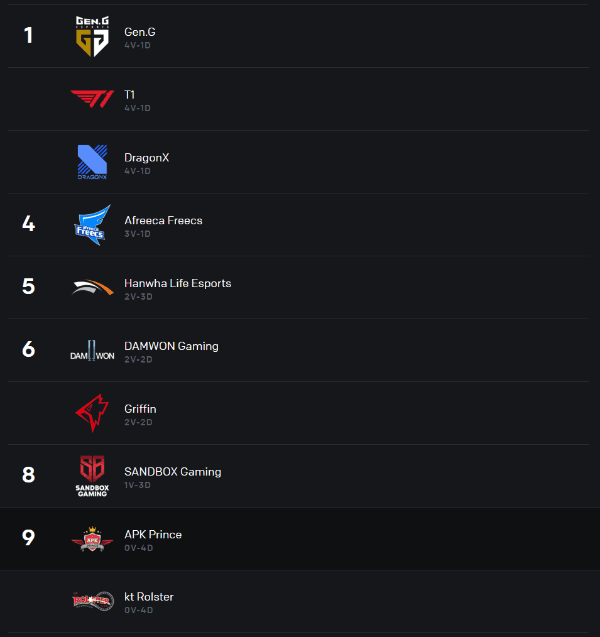 Con esto T1 se suma a lo más alto, y alcanza al mencionado DragonX y a Gen.G en lo alto de la tabla de posiciones. Todos suman cuatro triunfos y una derrota, en el caso de Gen.G fue ante DragonX y SKT cayó ante Hanwha Life Esports en su segunda presentación.