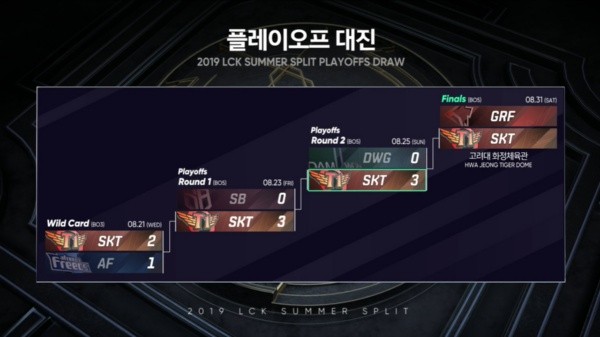 Semanas atrás Faker comentaba que no le importaba tener una baja plaza en los Playoffs de la LCK porque creía que SKT era mejor que todos en un Bo5, por el momento no ha fallado en su pronóstico. SK Telecom T1 entró a la fase decisiva por la Wild Card, luego de empatar con Afreeca Freecs en el cuarto puesto y, desde entonces, ha vencido a Sandbox Gaming y DAMWON Gaming por sendos y contundentes 3-0 en las llaves al mejor de cinco.
