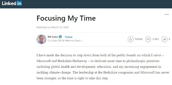 Luego de 45 años Gates decidió ponerle fin a su participación oficial en Microsoft, con motivo de dedicarse a sus tareas filantrópicas, buscando conseguir un mundo mejor. El anunciofue hecho por el propio Bill Gates, que comentó lo siguiente: