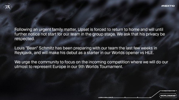 “A causa de un problema familiar urgente, Upset se vio forzado a regresar a su hogar y, hasta nuevo aviso, no será titular en nuestro equipo durante la Fase de Grupos. Pedimos que su privacidad sea respetada.