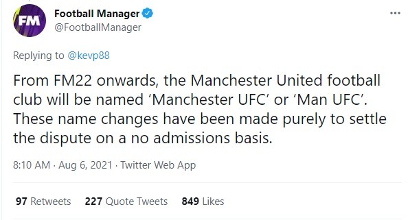 La posición oficial de SEGA y Sports Interactive es que no necesitan una licencia para usar el nombre del club,pero que lo han cambiado”como gesto de buena voluntad” para que ambas partes puedan dejar atrás el conflicto. Originalmente, Manchester United había demandado a los responsables de Football Manager en mayo de 2020.