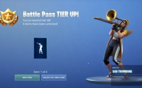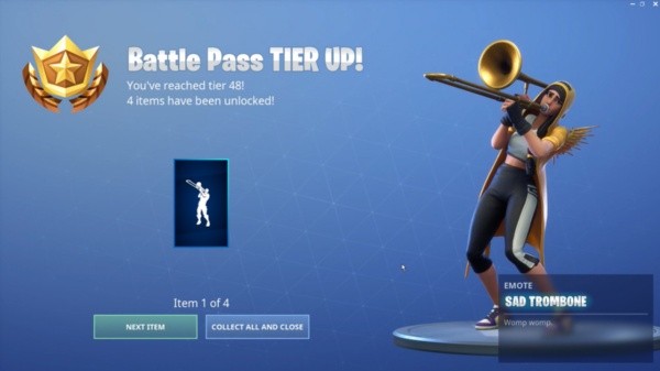 El gesto trombón triste es la recompensa por alcanzar el nivel 48 del Pase de Batalla de la Temporada 9. Será necesario tenerlo equipado en la rueda de gestos para poder conseguir el Fortbyte en el juego.