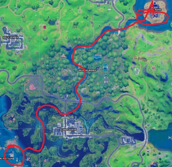 Como sabemos, desde el comienzo del evento Fortnitemares 2020, el nombre de La Autoridad se cambió al de Las Ruinas, pero sigue encontrándose en el centro del mapa. Por lo cual, la ruta más directa para llegar desde La Fortilla hata La Autoridad es mediante Alamedas Adormecidas, siguiendo el siguiente sendero acuático.