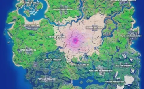 Si bien esta ubicación no tiene nombre, es el punto central del mapa de Fortnite. Está rodeado de arenas movedizas, donde si te quedas parado serás atraido y eliminado. Por el momento es una ubicación bastante chica y no causa efectos de baja gravedad como en temporadas pasadas, pero claro, apenas es el primer día y seguramente vaya expandiéndose con el correr de la temporada.
