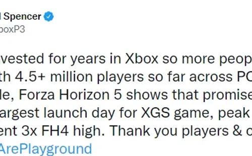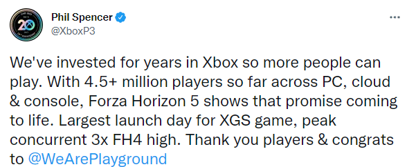 Tal como informó Phil Spencer, vicepresidente ejecutivo de gaming de la empresa, a través de Twitter, Forza Horizon 5 ya tiene 4,5 millones de jugadores a través de PC, consolas y cloud, convirtiéndolo en el mayor lanzamiento de XGS.