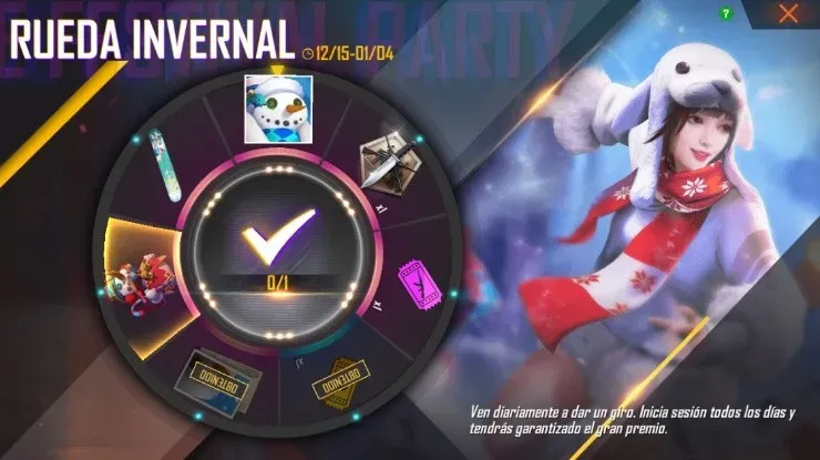 Diariamente podrás girar la ruleta una vez para obtener las diferentes recompensas, las cuales son: Ticket Oro Royale, Ticket Diamante Royale, Festival Invernal 2019 (Banner), Festival Invernal 2019 (Avatar), Token del Tesoro, Guerra de Nieve (Tabla), Muñeco de Nieve (Mochila).