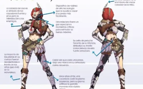 Otra guerrera de mil batallas, la Cazadora Sangrienta también ha pasado un largo tiempo en la naturaleza. Tiempo que le ha permitido conseguir partes nuevas en su armadura, pero que también le ha costado una de sus piernas, la cual ha sido reemplazada por una artificial, que le permite moverse con mayor velocidad.