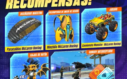 Entre el 31 de julio y el 1 de agosto, todos aquellos que inicien sesión recibirán varios regalos exclusivos. Entre las recompensas se encuentra un Paracaídas y una Mochila, por supuesto todo tematizado con McLaren. Además, quienescompleten la misión durante el fin de semana recibirán una Camioneta Monster-McLaren.