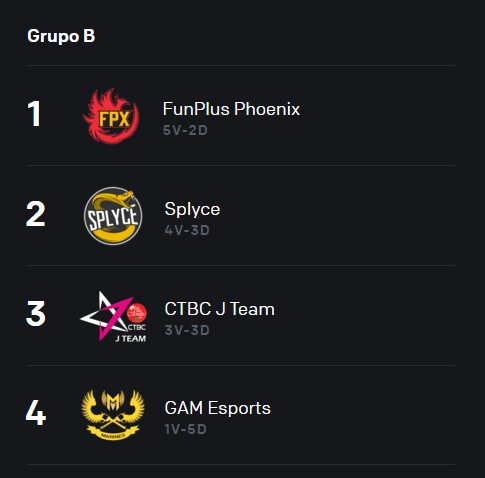 Sin embargo, el gran ganador del grupo fue el favorito, FunPlus Phoenix, que a pesar de tener malas presentaciones (el primero duelo ante J Team y sus dos juegos frente a Splyce), en el resto de las partidas demostró su superioridad y el motivo por el cual es considerado favorito. Su consistencia estará a prueba a partir de los Cuartos de Final, cuando el formato se cambie a enfrentamientos al mejor de cinco entre dos equipos.