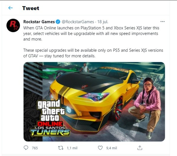 “Cuando GTA Online sea lanzado para PS5 y Xbox Series X|S más adelante este año, algunos vehículos seleccionados serán mejroables con todo tipo de nuevas mejoras de velocidad y más. Estas mejoras especiales sólo estarán disponibles en las versiones de GTA V para PS5 y Xbox Series X|S. Pronto revelaremos más detalles”.