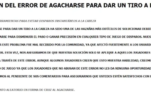 El error de agacharse para dar un tiro a la cabeza ha sido una de las hazañas más difíciles de solucionar debido a la naturaleza de la acción de agacharse para disminuir el paso o ganar precisión en cualquier tipo de juegos de disparos. Nuestro primer intento de solucionar este problema fue mal recibido por la comunidad, ya que afectó fuertemente a los usuarios que no estaban abusando de este error. Esta vez, nos aseguramos de que nuestra solución sólo se aplique a aquellos jugadores que intentan obtener una ventaja a través de este error. Aunque algunos jugadores creen que esto muestra habilidad, creemos que no va acorde a nuestro tipo de juego, ya que los jugadores que no abusan de este error no les da ninguna oportunidad de contraataque. Estaremos al pendiente de sus comentarios para asegurarnos que ustedes estén satisfechos con el ajuste.