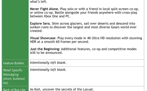 Así mismo y según esta filtración, el juego estará diseñado para soportar gráficos 4K en Ultra HD con la posibilidad de aguantar 60 fps. También contará con la posibilidad de jugar un amigo a pantalla partida u online y juego cruzado entre PC y Xbox One.