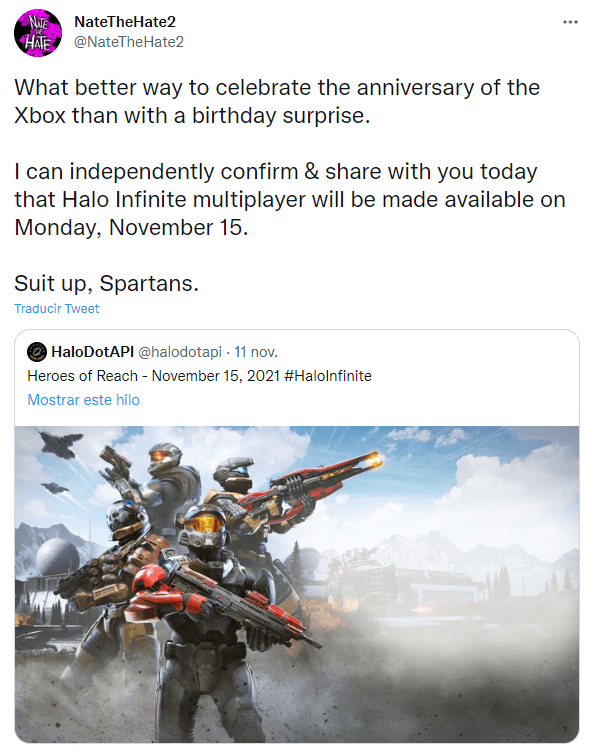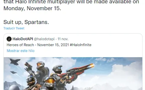 La cuenta HaloDotAPI twitteó que el multijugador comenzaría el próximo lunes 15 de noviembre, con su primera temporada Heroes of Reach. Esta fecha no tiene demasiado sentido, hasta que consideramos que es el 20° aniversario de Xbox.